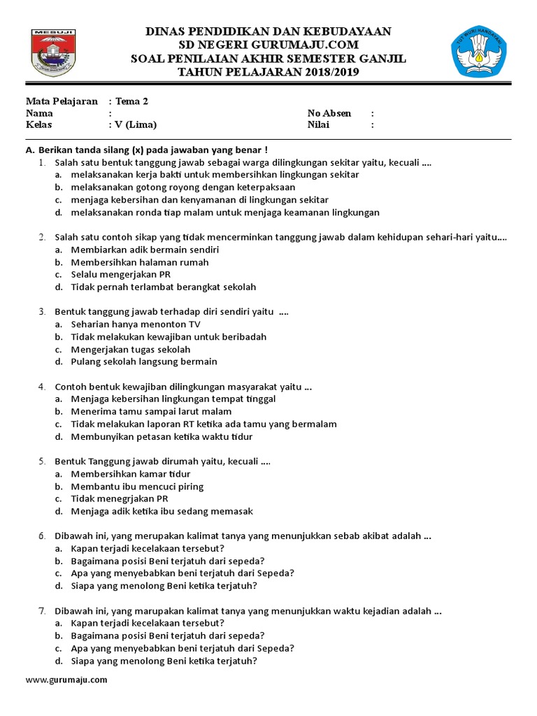 Dinas Pendidikan Dan Kebudayaan Soal Penilaian Akhir Semester Ganjil Tahun Pelajaran 2018 2019