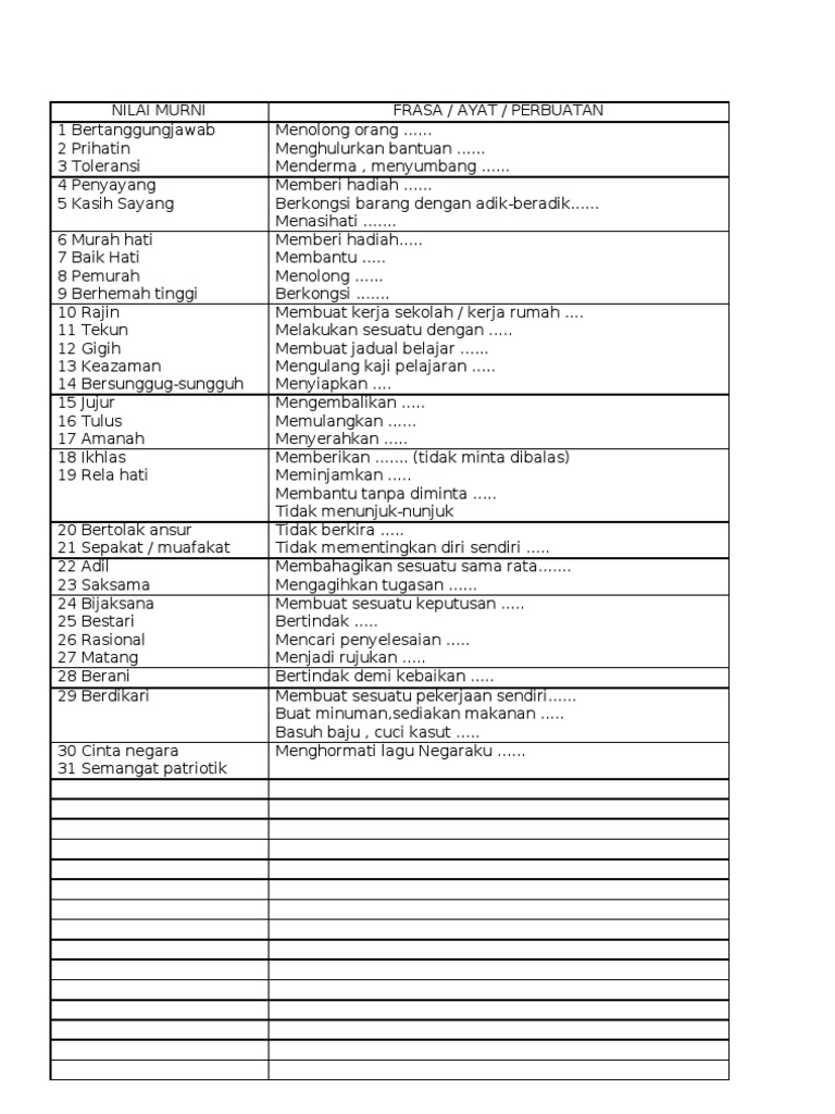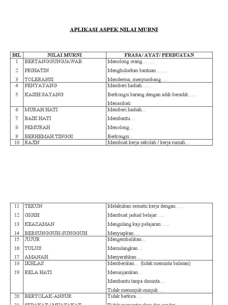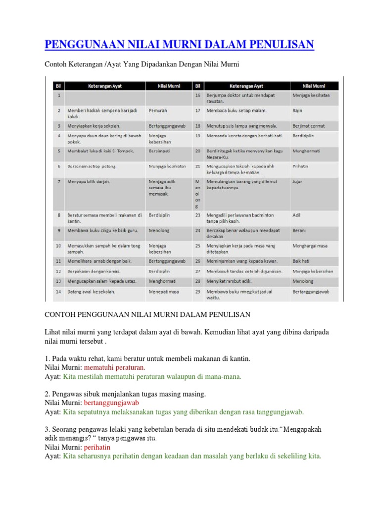 Cadangan Nilai Murni Dan Pengajaran Berdasarkan Petikan Docx Document